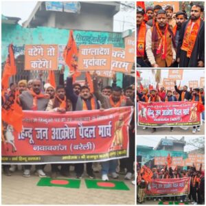 बरेली। बांग्लादेश में हिंदू समाज पर हो रहे अत्याचारों और हत्याओं के विरोध में नवाबगंज क्षेत्र में शनिवार को जन आक्रोश देखने को मिला। श्री राजपूत करणी सेना और हिंदू जन आक्रोश मंच के आह्वान पर बड़ी संख्या में कार्यकर्ताओं ने पैदल मार्च निकालकर विरोध दर्ज कराया।