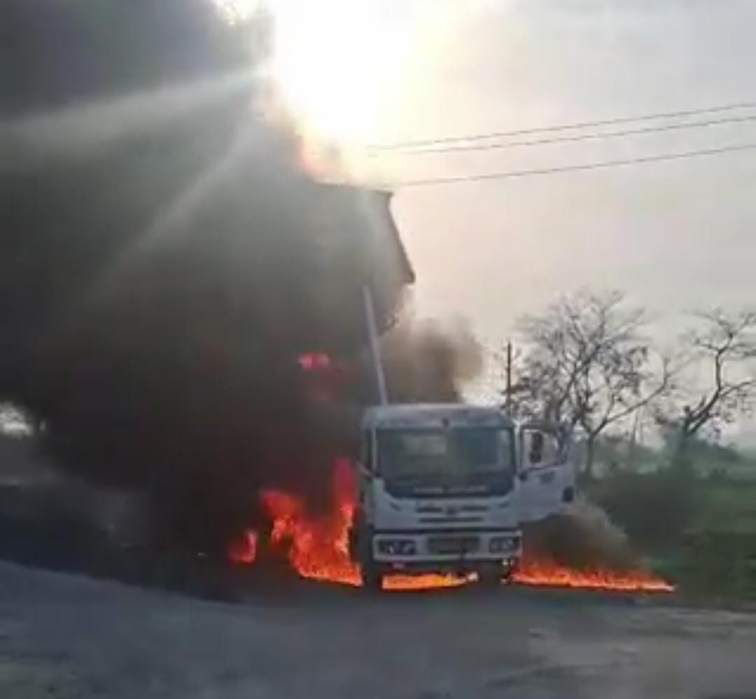 गिट्टी उतारते वक्त हुआ बड़ा हादसा, हाईटेंशन लाइन ने डंफर को बना दिया आग का गोला