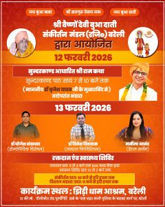 मंडल से मिली जानकारी के अनुसार 12 फरवरी को शाम 7 बजे से 10 बजे तक वैष्णो देवी धाम में सुंदरकांड पाठ का आयोजन होगा। सुंदरकांड का वाचन डॉ. बृजेश यादव के मुखारविंद से किया जाएगा। पाठ के उपरांत श्रद्धालुओं के लिए भंडारे की व्यवस्था भी रहेगी, जिसमें बड़ी संख्या में भक्तों के शामिल होने की संभावना है। आयोजकों ने श्रद्धालुओं से समय पर पहुंचकर कार्यक्रम का लाभ लेने की अपील की है।