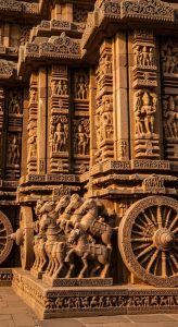🚩 मंदिर में 24 विशाल पहिए — जिन्हें दिन के 24 घंटों का प्रतीक माना जाता है