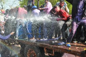 रथ के आगे-आगे ट्रैक्टर से जुड़े तीन ठेलों में रंग से भरे ड्रम रखे थे। पंपों के जरिए रंगों की फुहारें उड़ाई जा रही थीं। डीजे पर बज रहे होली गीतों पर हुरियारे झूमते-नाचते आगे बढ़ते रहे। शहर की फिज़ा ‘होली है!’ के नारों से गूंजती रही।