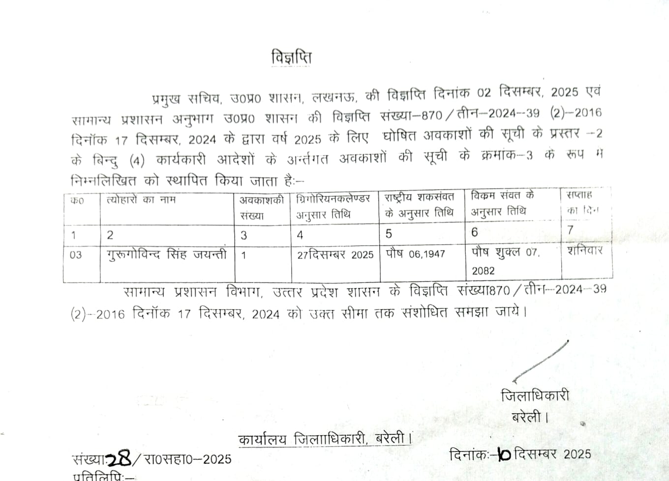 बरेली मे 27 दिसंबर को गुरु गोविंद सिंह जयंती पर रहेगा सार्वजनिक अवकाश बरेली। उत्तर प्रदेश शासन ने वर्ष 2025 के घोषित सार्वजनिक अवकाशों की
