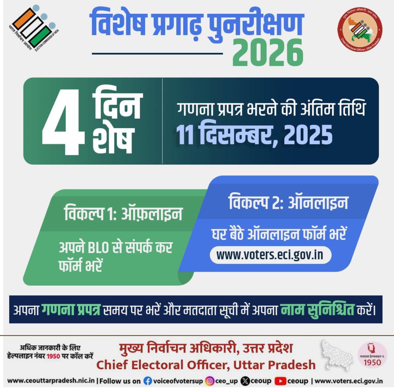 उत्तर प्रदेश में (SIR) विशेष प्रगाढ़ पुनरीक्षण 2026: मतदाता सूची में नाम जुड़वाने के लिए अब केवल चार दिन शेष