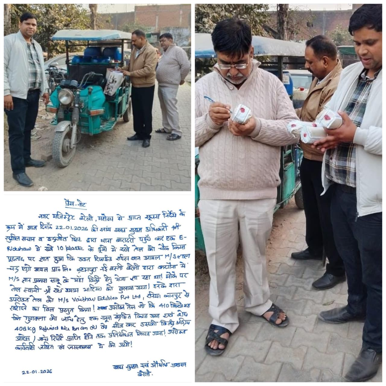 बरेली के श्यामगंज मे मिलावट के शक में हुआ बड़ा एक्शन: ई-रिक्शा से जा रहा 10 ड्रम खाद्य तेल पकड़ा गया एफएसडीए–पुलिस की संयुक्त